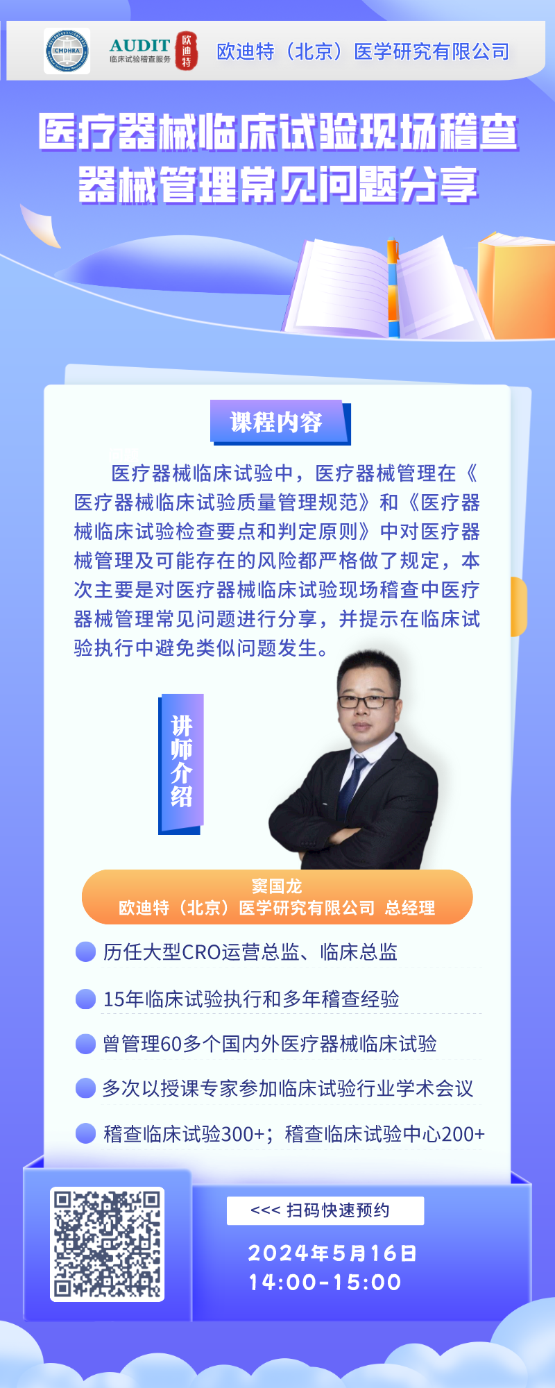 欧迪特医学是一家专做第三方独立临床试验稽查的公司,此次会议主要是讲解医疗器械临床试验现场稽查常见问题和药品临床试验稽查常见问题分享。