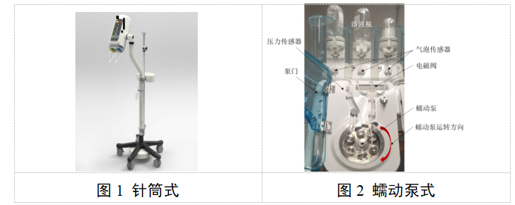 造影注射设备的注射原理通常包括针筒式、蠕动泵式两种。针筒式注射设备通过电动装置推动活塞,使针筒内压力增加,推出造影剂或生理盐水实现注射(图1);蠕动泵式注射设备通过蠕动泵电机控制蠕动泵头挤压管道实现注射(图2)。申请人应详细说明产品注射的原理。