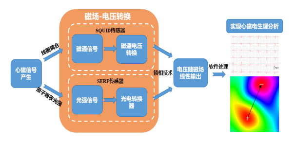 心磁信号采集设备通过传感器获取人体心磁信号,并将该心磁信号转换为电压信号,送入到主控系统,再通过软件进行分析和处理。具体原理见附件1。