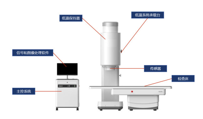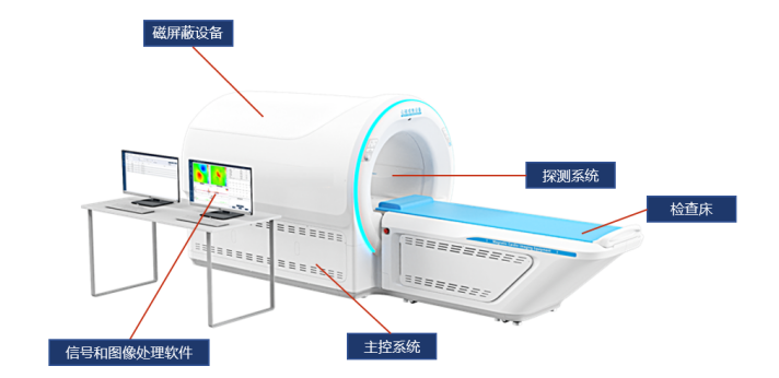 产品一般包括主控系统、磁屏蔽设备(若有)、探测系统(包括传感器探头、低温保持器、低温系统承载台)、检查床、信号和图像处理软件。