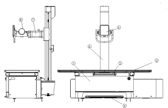 ① 床身 ②床面板 ③探测器或暗盒托盘 ④控制盒 ⑤脚踏控制装置