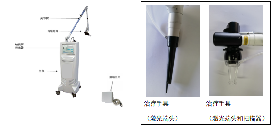 二氧化碳激光治疗设备通常由二氧化碳激光器、电源和控制模块、安全防护模块、冷却模块和传输模块(如导光臂、光纤)及附件(可包括治疗手具、点阵扫描装置、脚踏开关、激光防护镜等)组成。注册申请人可根据申报产品实际情况进行描述。应注意,产品组成中主机包含的不同模块不应命名为“系统”。附件的类型与产品适用证相关,应具有对应性。