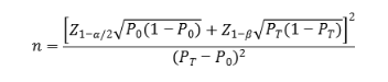 公式中,n为样本量;Z1-α/2、Z1-β为显著性水平和把握度的标准正态分布的分数位,P0为评价指标的临床可接受标准,PT为申报产品评价指标预期值。
