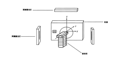 移动式激光定位设备:安装在X、Y、Z方位的激光灯组通过手动或者遥控调节,可分别投射出相互垂直共面的矢状面、冠状面和横断面激光线,控制装置按照模拟定位系统确定的摆位坐标驱动激光灯组移动到定位点,并在患者体表两侧及上表面显示出“十”字标记点,以便放射治疗时对患者病灶进行定位。