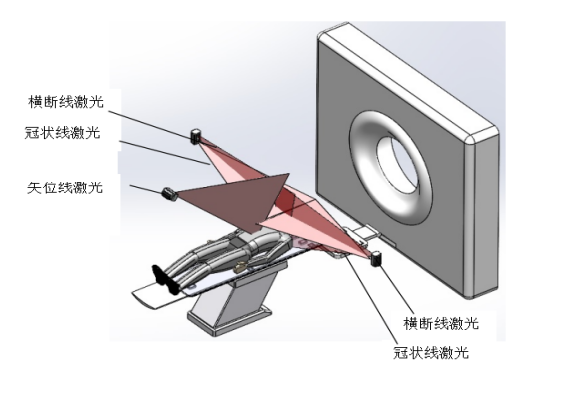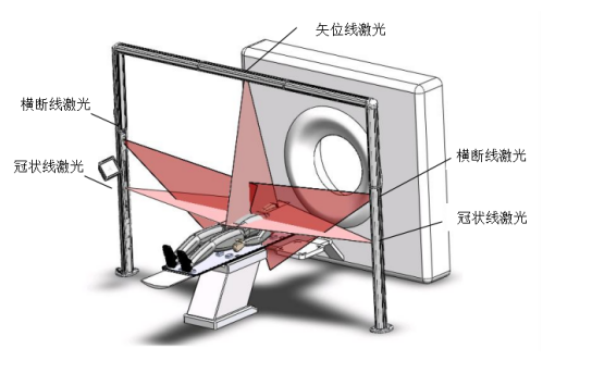 固定式激光定位设备:固定式激光定位设备主要安装在放射治疗室,在X、Y、Z方位的激光灯可分别投射出相互垂直共面的矢状面、冠状面和横断面激光线,各线的交点与放射治疗设备的等中心点完全重合,进行患者摆位时,在患者体表两侧及上表面显示出“十”字标记点,用于放射治疗时对患者病灶进行定位。