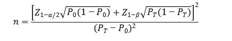 公式中,n为样本量;Z1-α/2、Z1-β为显著性水平和把握度的标准正态分布的分数位,P0为评价指标的临床可接受标准,PT为试验体外诊断试剂评价指标预期值。