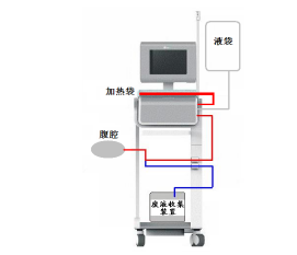 利用重力方法,液体由高向低流动的特性,实现腹膜透析液从高点流向腹膜透析设备,经过腹膜透析设备加热灌入患者腹腔,经留腹透析后引流到废液收集装置内的方式。(透析液袋高于腹膜透析设备的加热装置)